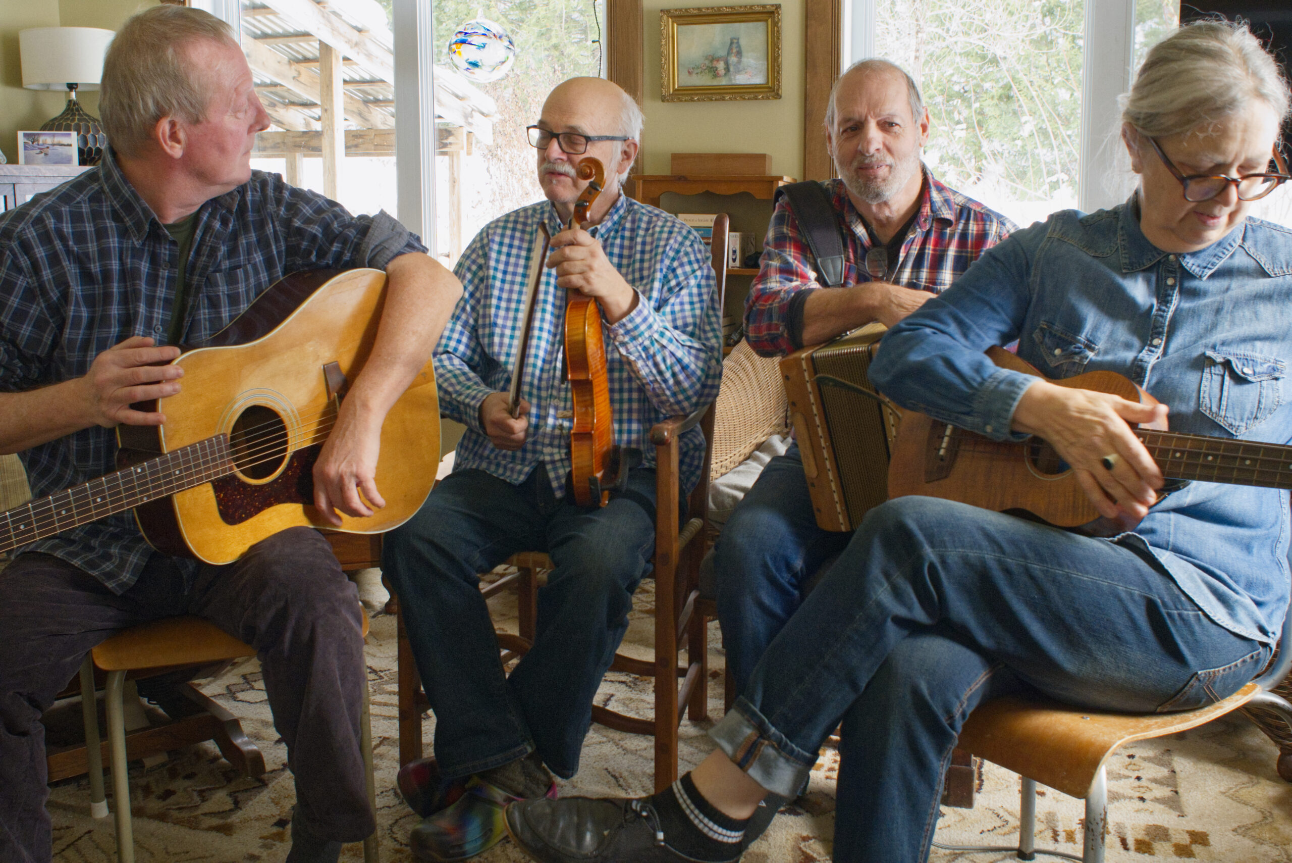 Jean Cantin (guitare, voix) a joué avec son frère Gilles dans le groupe Guignolée (1985) ainsi que dans le groupe la Famille Cantin. Michel Leblanc (accordéons, harmonica, voix) a appris un répertoire auprès des Irlandais dans son village natal de Rawdon, et a partagé souvent ces bijoux musicaux dans les sessions de la région. Claude Méthé (violon, mandola, voix) est le cofondateur du groupe le Rêve du Diable (1976) et a joué avec plusieurs formations (Manigance, Entourloupe, Zigue). Dana Whittle (basse, podorythmie, voix), québécoise par adoption, a joué la musique folk et trad depuis sa jeunesse. En partenariat avec Claude depuis plus de 30 ans (Jeter le Pont, Dentdelion, Zigue), elle apporte un peu de perspective féminine à ce groupe de gars!